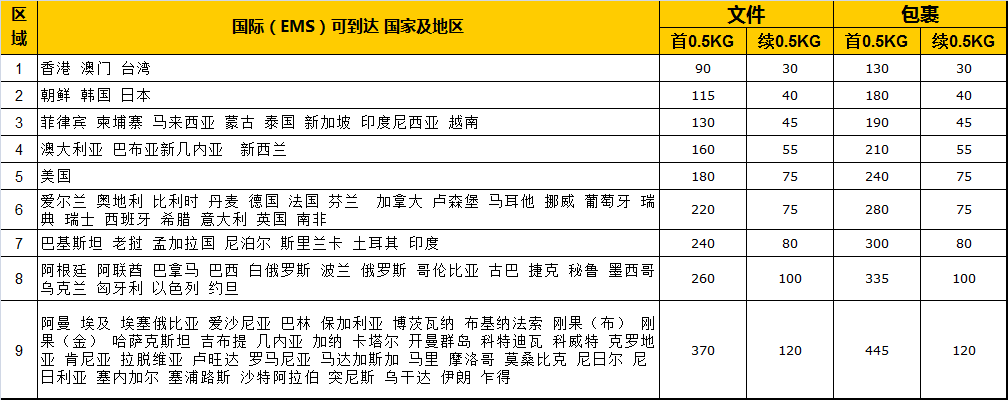 提示:具体通达国家及重量,尺寸标准来电咨询!EMS报价变动性较大,交货时请来电咨询! 所有EMS出口件只包出口,不包目的地海关清关与签收结果!