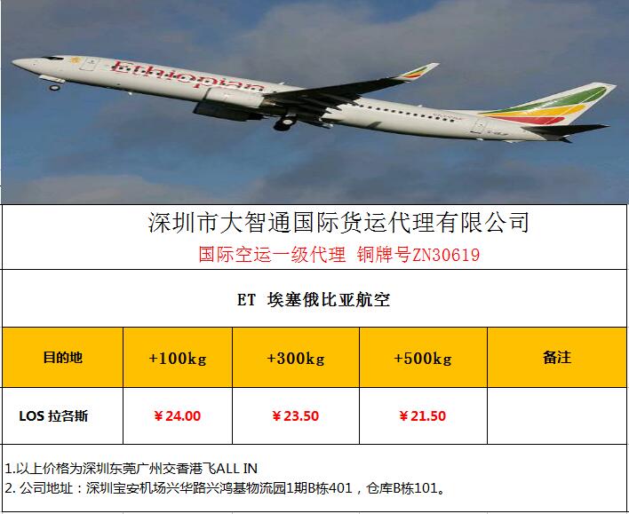 温馨提示:以上价格仅到机场,到门价格请来电咨询:0755-29982715,国际空运专线ET埃塞俄比亚最新特价限时不限量,本优惠仅限即日起至下次调调价,请果断下单哟!相关热词搜索:深圳大智通国际货运 埃塞俄比亚航空 拉各斯空运
