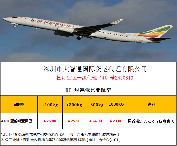 香港直飞,ADD亚的斯亚贝巴新空运价格,清关快捷安全方便,为你提供一站式的服务保障!价格低,时效快。深圳大智通国际空运,20年老牌,值得信赖??!热线:0755-29982715.