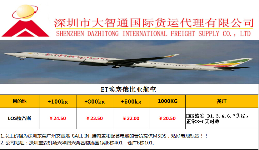 拉各斯空运专线是我们深圳大智通国际货运公司新推出的国际空运航线之一,由于是空运专线服务,所以就有优势,拉各斯空运价格方面也就非常实惠,吨价可以低到20.5元每公斤以下,每天都有航班直飞,走ET(埃塞俄比亚航空公司)欢迎广大新老顾客朋友咨询本公司关于拉各斯空运专线的详情