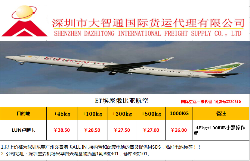 香港直飞,ET埃塞俄比亚最新空运价格卢萨卡空运专线是我们深圳大智通国际货运公司新推出的国际空运航线之一,由于是空运专线服务,所以就有优势,卢萨卡空运价格方面也就非常实惠,吨价可以低到26.0元每公斤以下,每天都有航班直飞,走ET(埃塞俄比亚航空公司)欢迎广大新老顾客朋友咨询本公司关于卢萨卡空运专线的详情