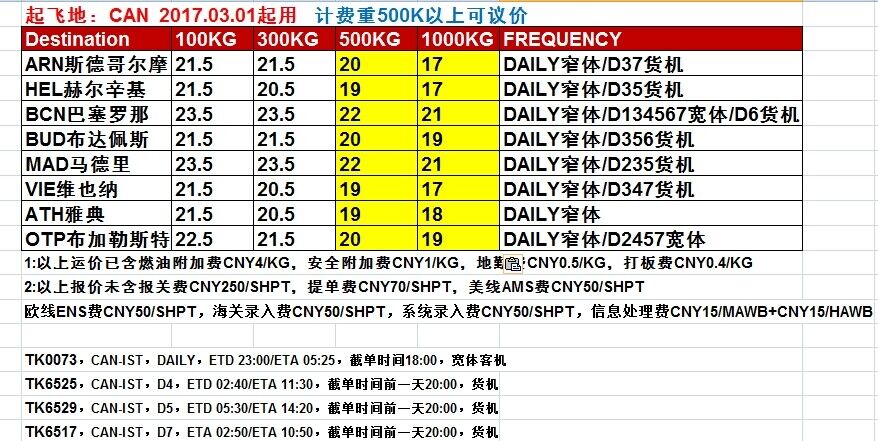 大智通国际货运为广大客户提供TK欧洲空运服务,本公司多年致力于国际空运出口服务,有丰富的国际空运经验,有解决空运各种疑难杂症的方案,对各种难运的特殊的货运物品有丰富的操作经验,能顺利空运到目的港,可走真、仿牌,电池等特殊货物; 而且大智通国际空运公司与众多航空公司合作,航班资源非常密集,TK欧洲空运价格也就变得非常实惠,欢迎来电咨询:400-0755-028,QQ:2853026091