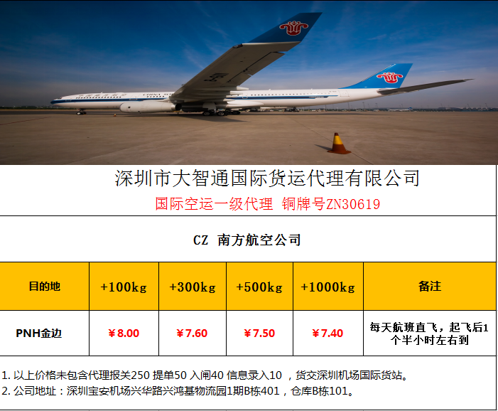 大智通国际空运历经深圳到PNH金边空运出口20年洗礼,空运进口12年锤炼,团队专业经验丰富,为客户提供最低价、最快的国际空运舱位,24小时全天候提供客户咨询服务:400-0755-028