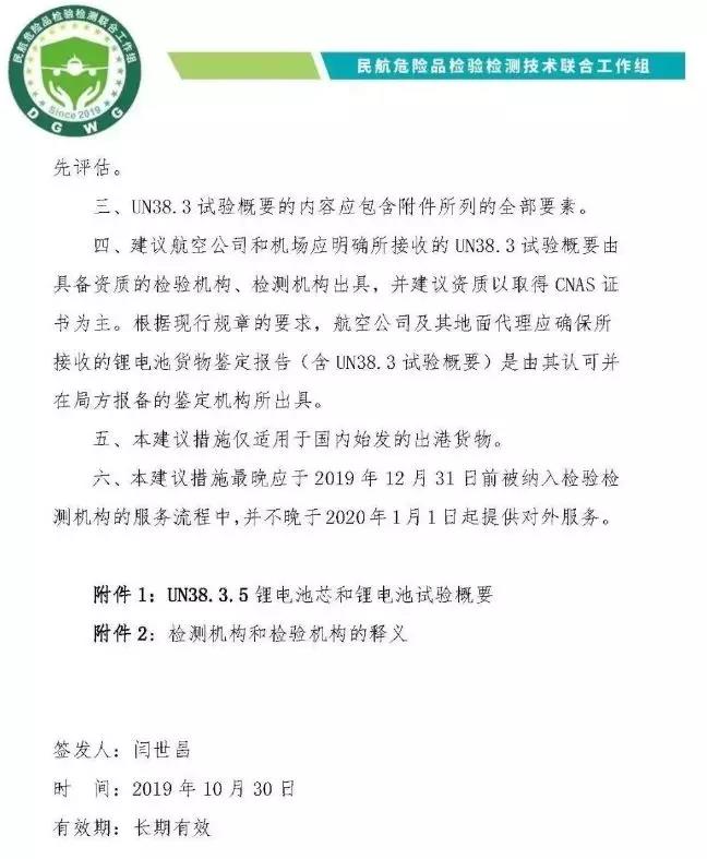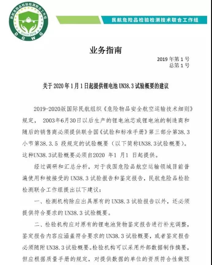 近日,我国民航总局对2020年1月1日开始的锂电池空运需要的UN38.3试验概要提出规范要求。