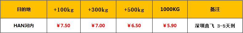 温馨提示:以上价格仅到机场,到门价格请来电咨询:0755-29982715,空运到越南HAN河内最新特价限时不限量,本优惠仅限即日起至下次调调价,请果断下单哦!