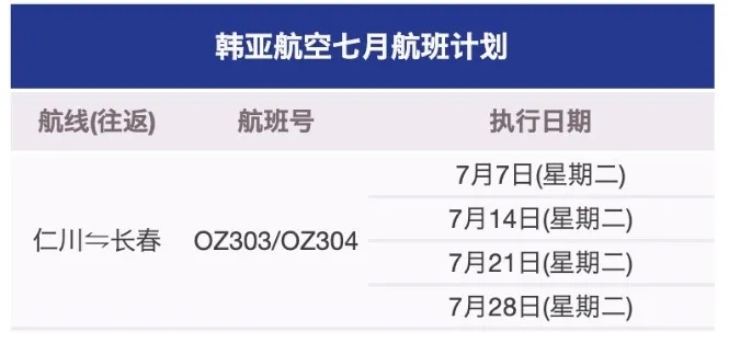 据韩亚航空17日消息,韩亚航空更新了7月航班计划,韩亚航空7月计划运营仁川=长春每周二航线。