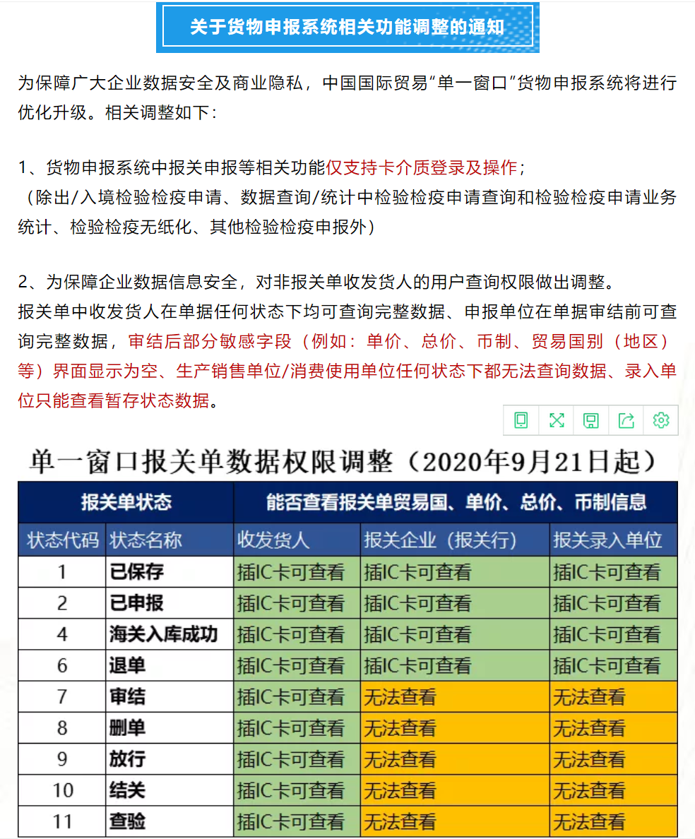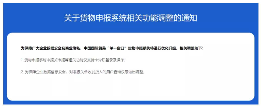 9月21日,单一窗口发布关于货物申报系统相关功能调整的通知,为保障企业数据安全及商业隐私,货物申报系统中报关申报等相关功能仅支持卡介质登录及操作,对非报关单收发货人的用户查询权限做出调整。