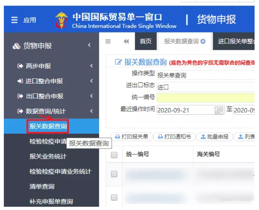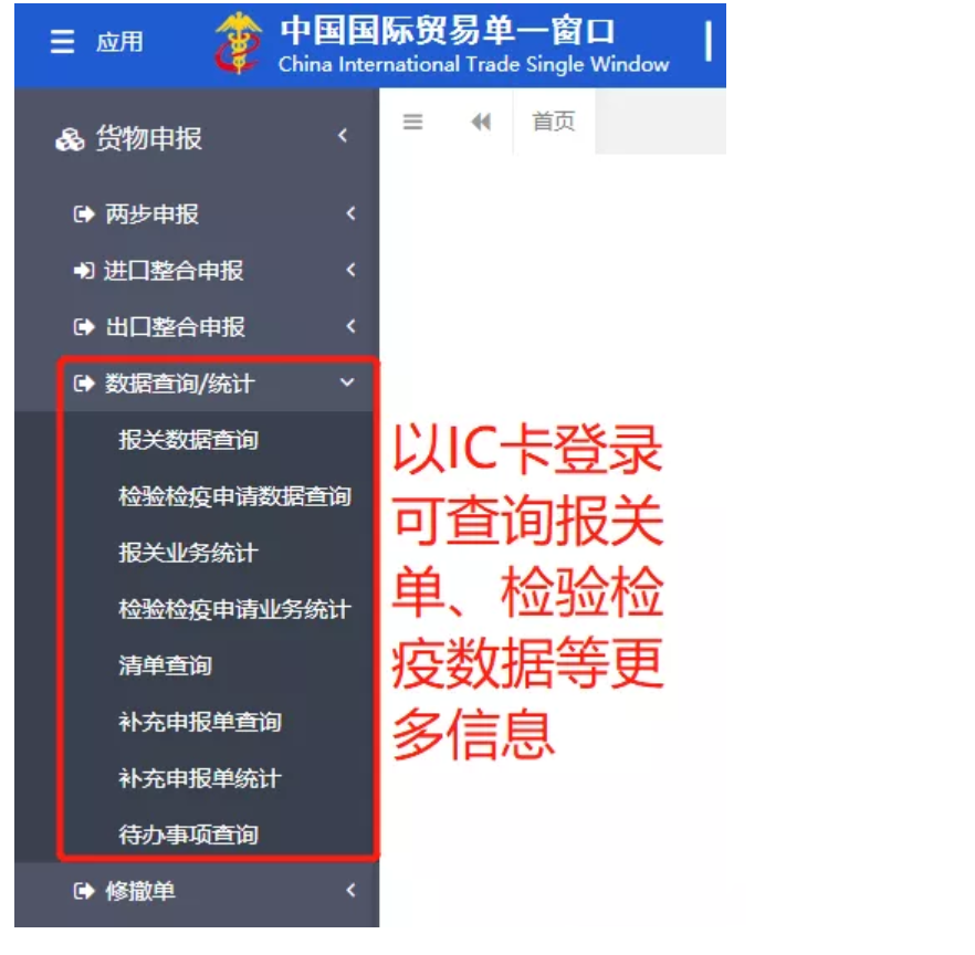 货主插IC卡登录单一窗口,在货物申报栏目左侧的“数据查询/统计”功能,如下图: