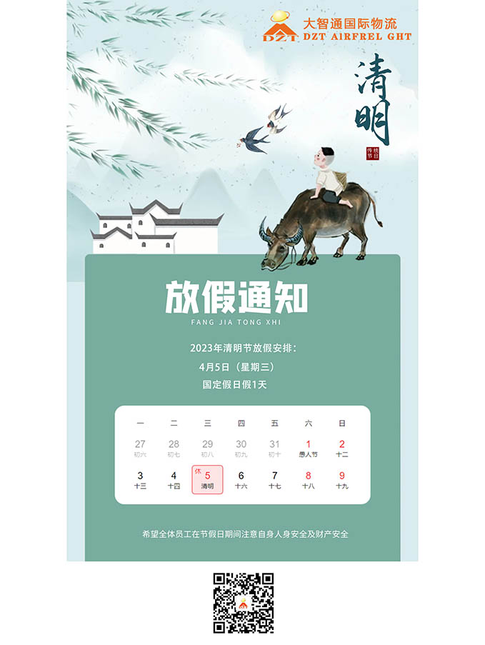您好!感谢您长久以来对我司的信任与支持,清明节即将来临,根据国家法定节假日放假规定及结合我司实际情况,做出以下假期安排: