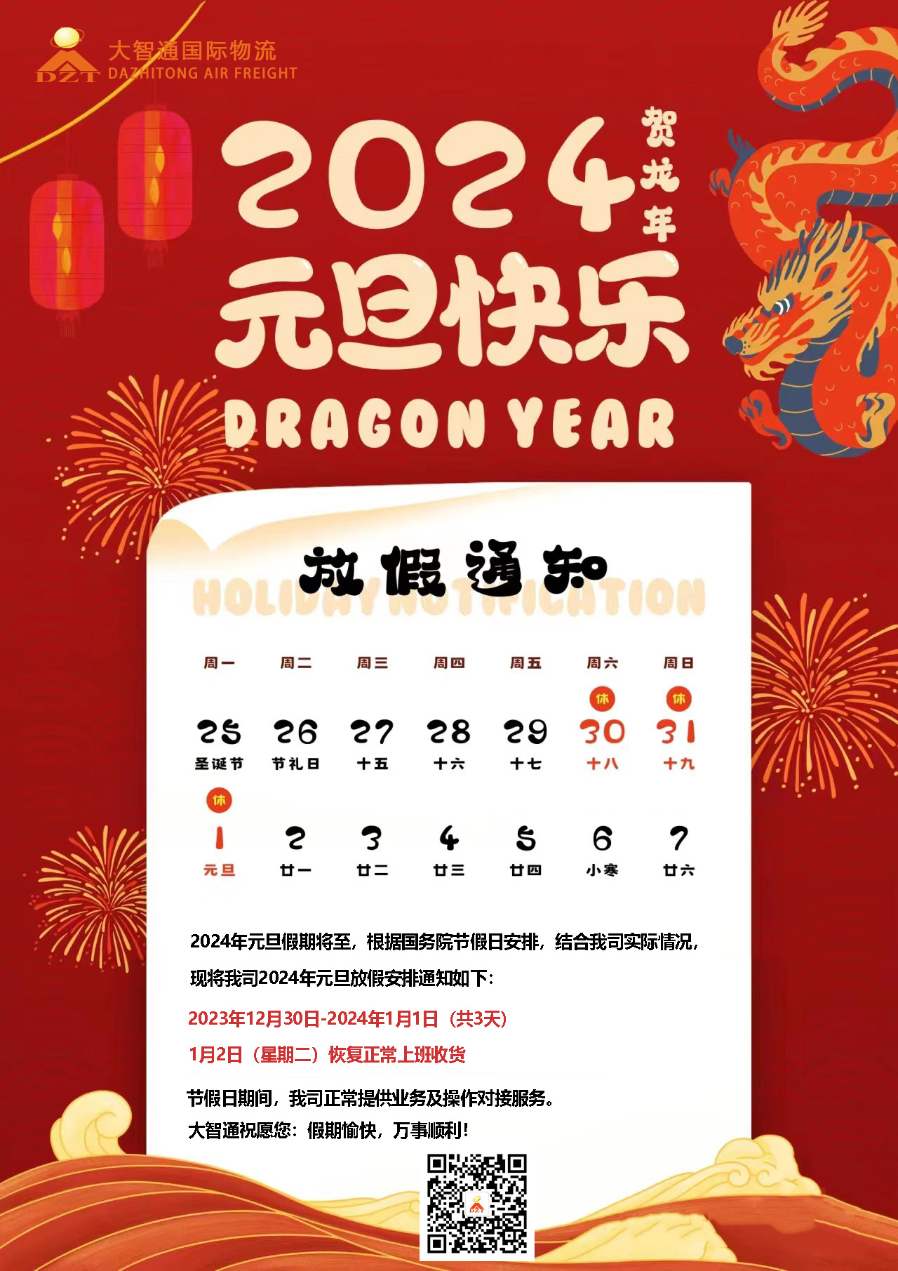 一,2023年12月30日和2024年1月1日,放假3天,12月31日(星期日)仓库正常上班收货
